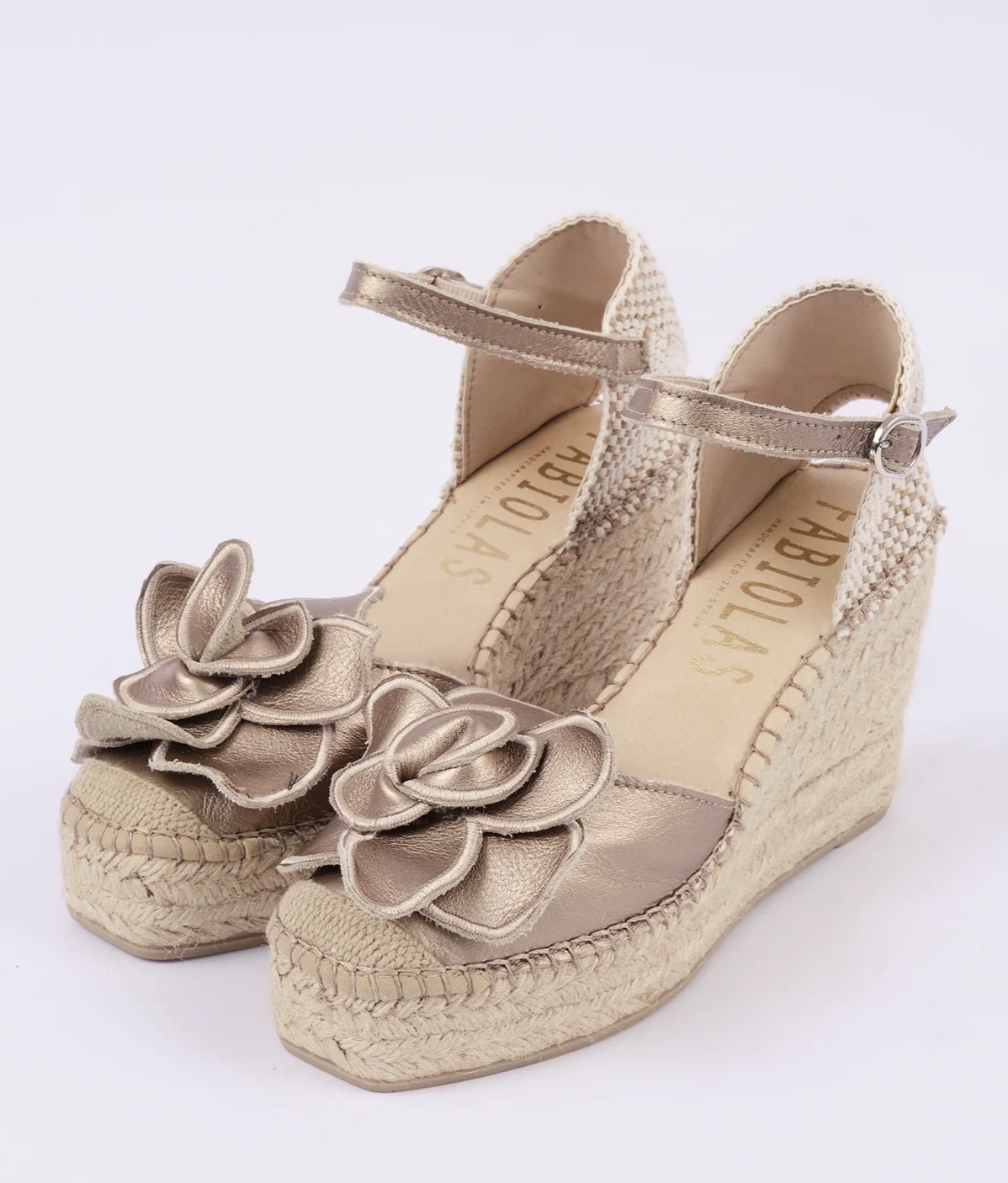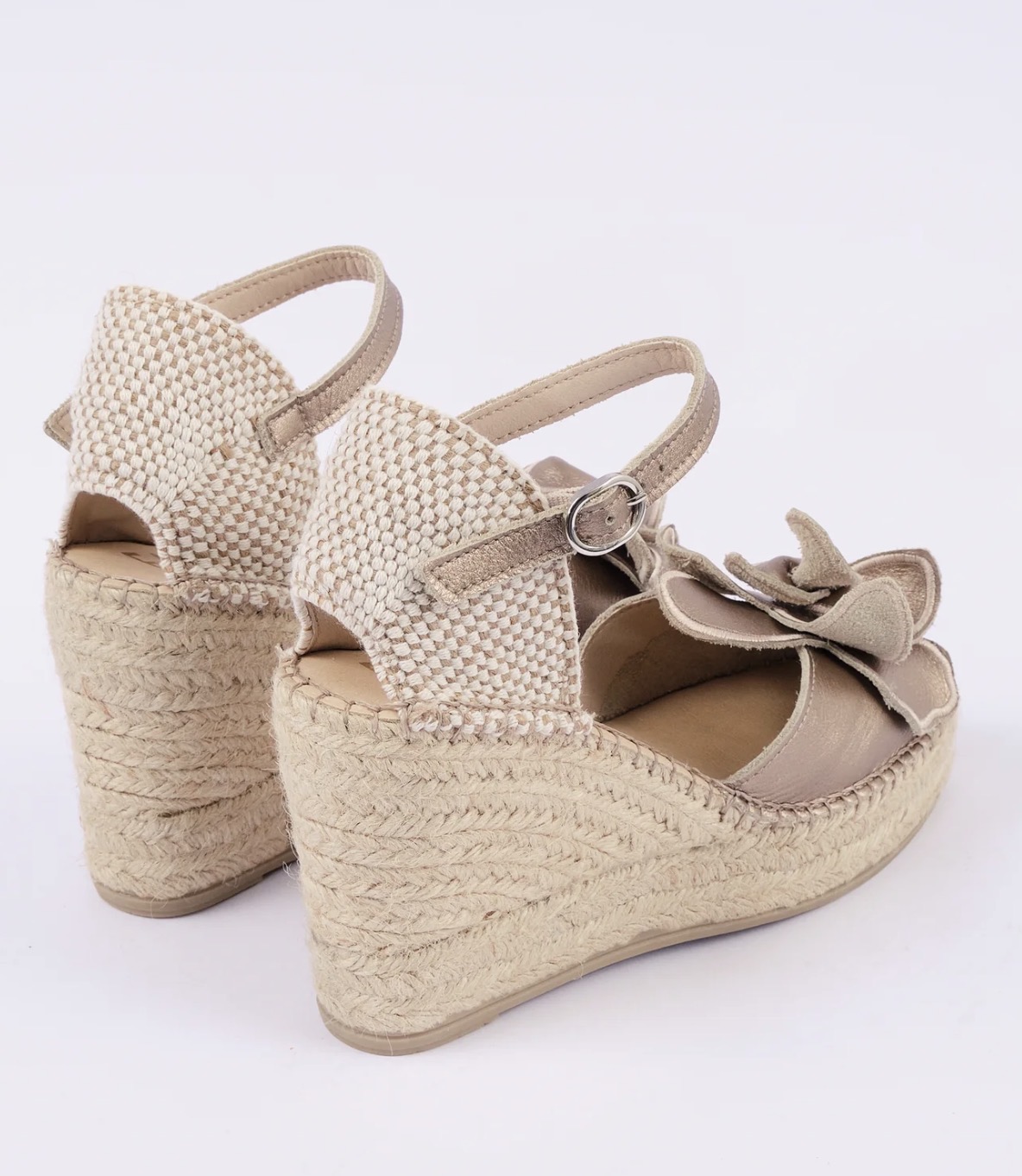 Alpargata cerrada de cuña alta con puntera cuadrada elaborada en laminado bronce.
