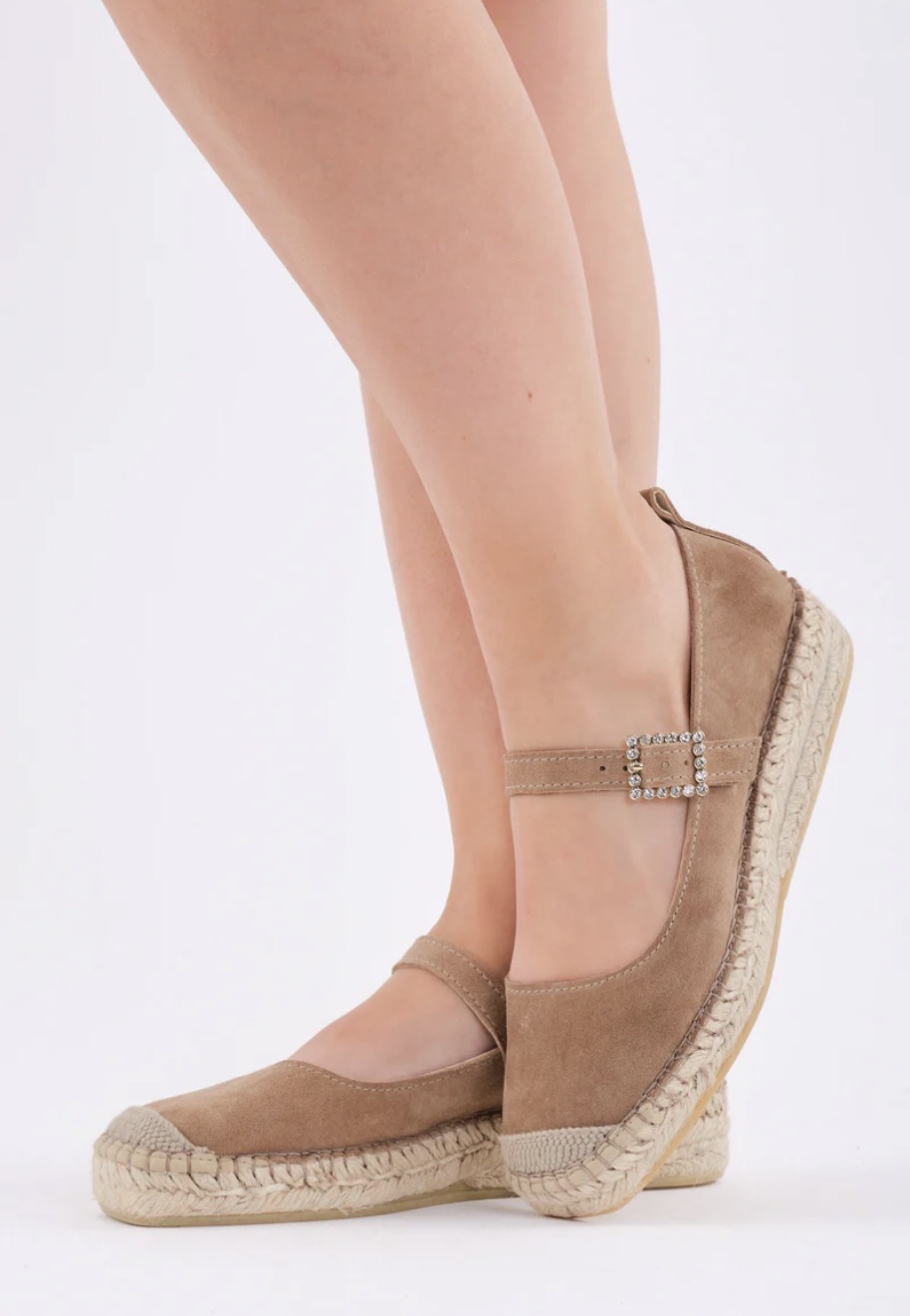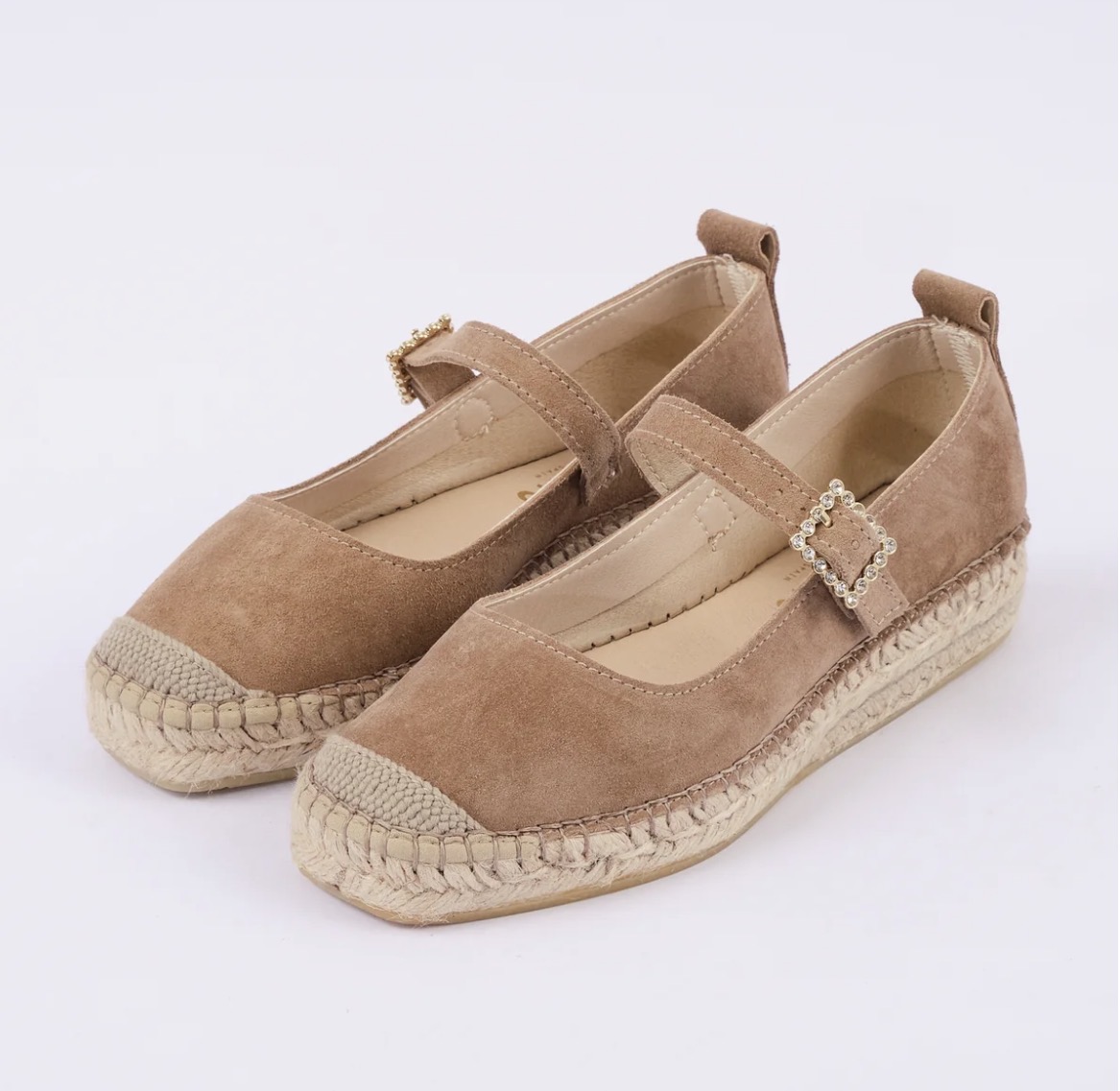 Alpargata plana cerrada elaborada en serraje sahara con hebilla cuadrada de cristales y pulsera al tono para atar al pie.