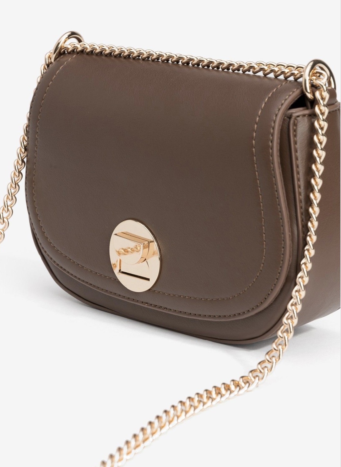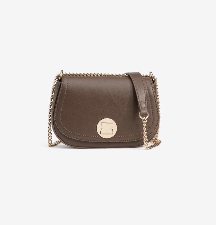 Bolso bandolera en tono chocolate con cadena dorada y cierre metálico frontal elegante.