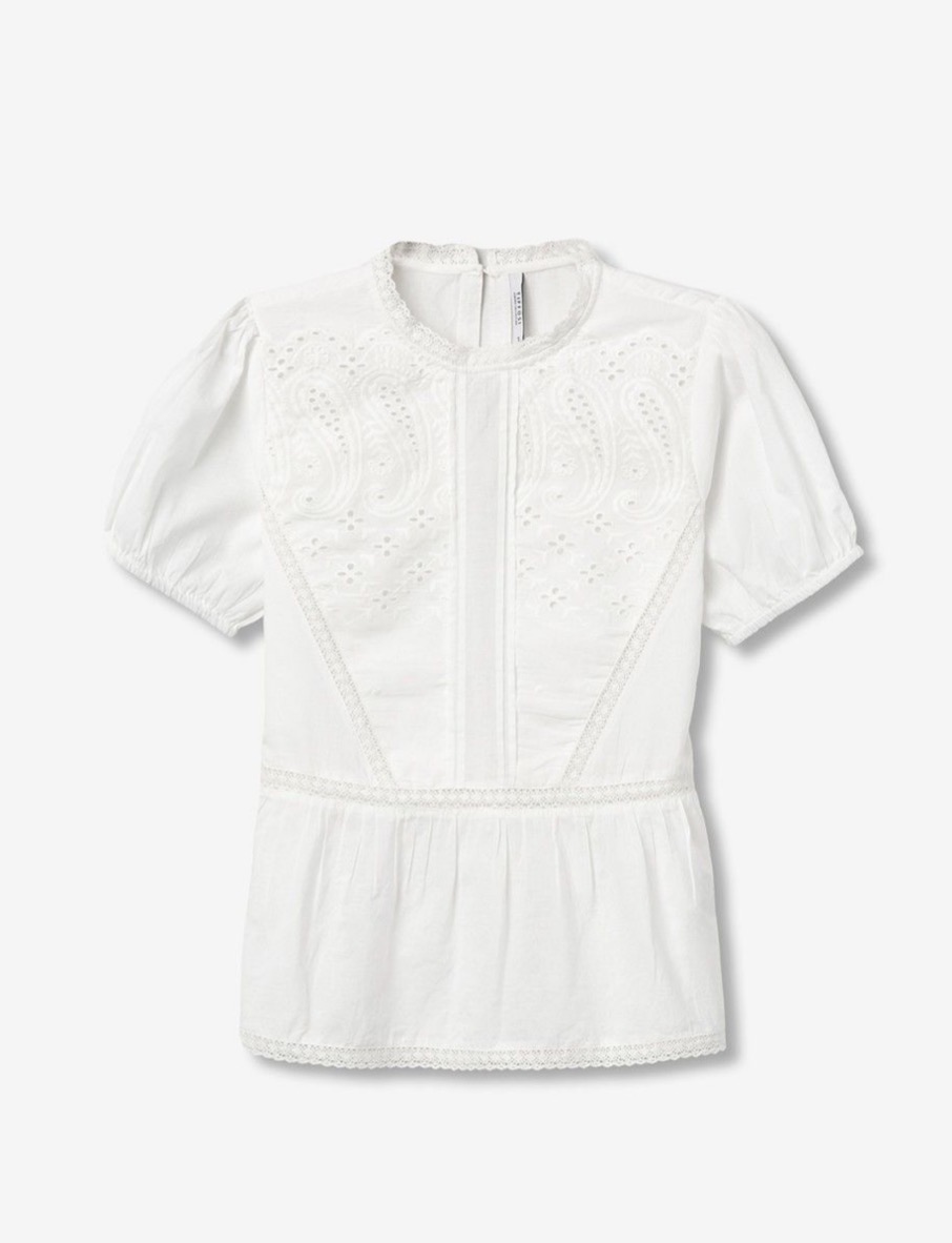 Blusa blanca de manga corta con bordados delicados y corte regular, ideal para un look casual.