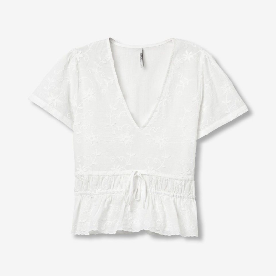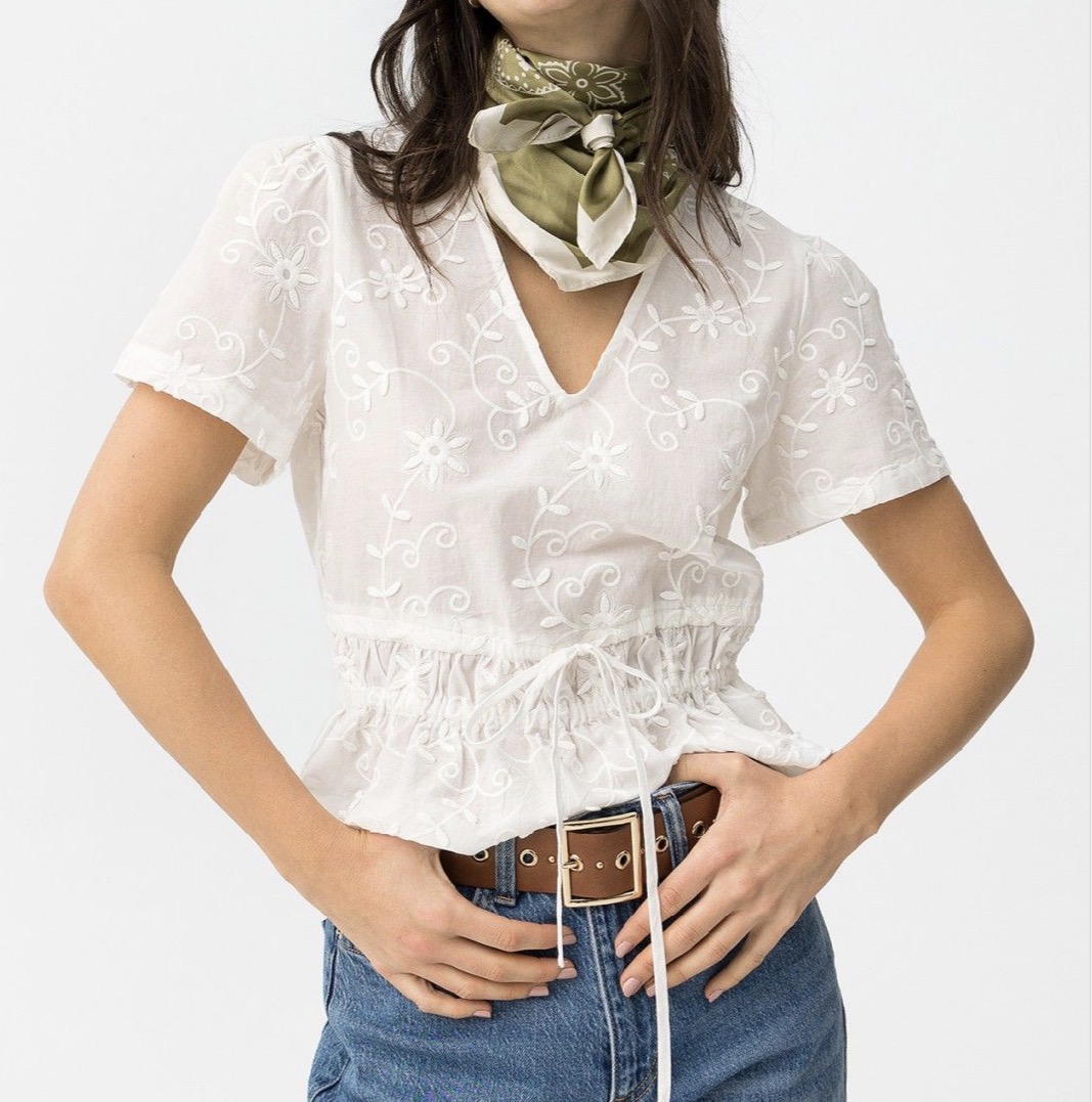 Blusa de color crudo con bordados florales, mangas cortas y ajuste con cordón en la cintura.