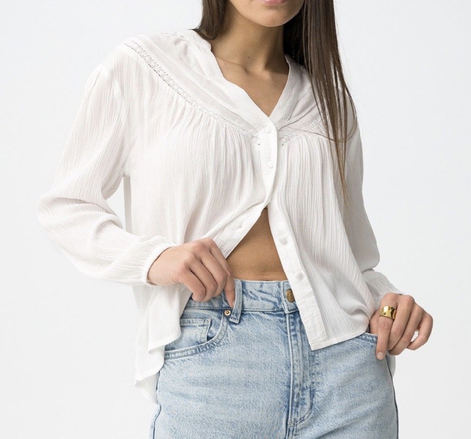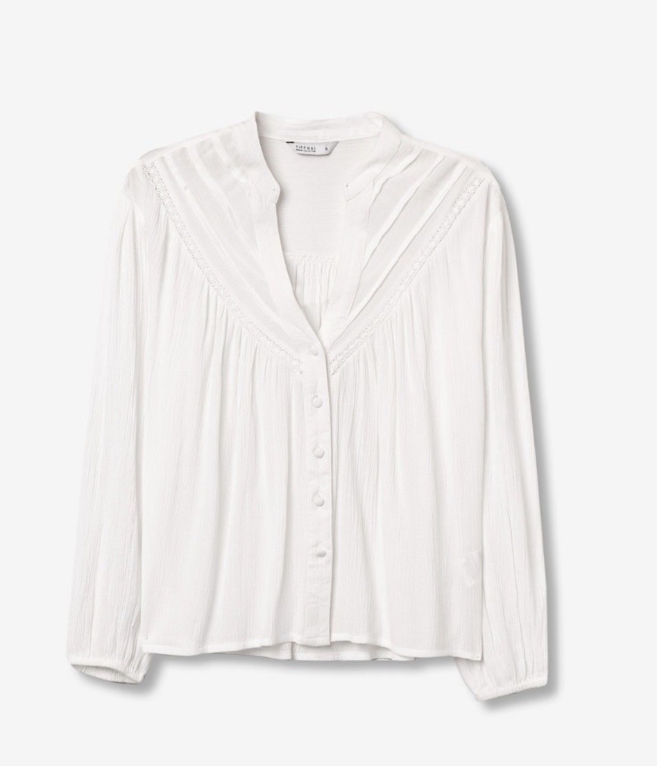 Camisa blanca de manga larga con diseño relajado y detalles plisados, perfecta para un look casual.
