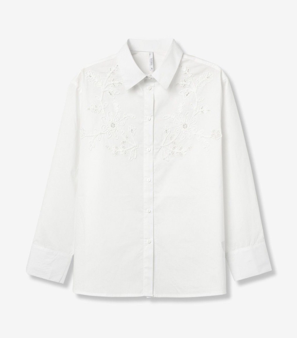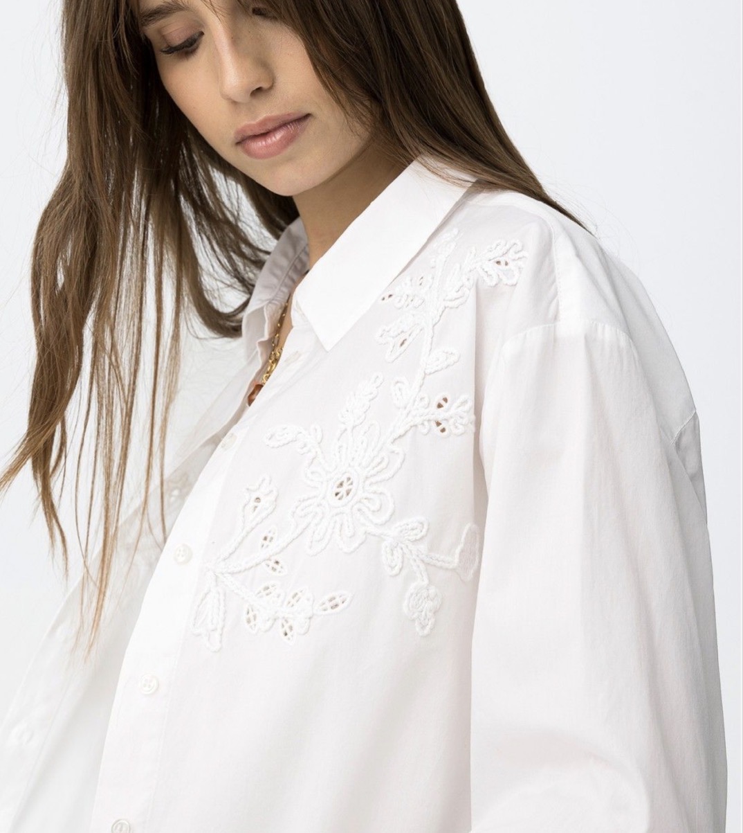 Camisa de color blanco, corte relaxed, manga larga, detalles bordados en la parte superior delantera.