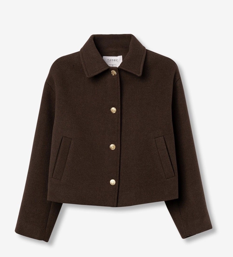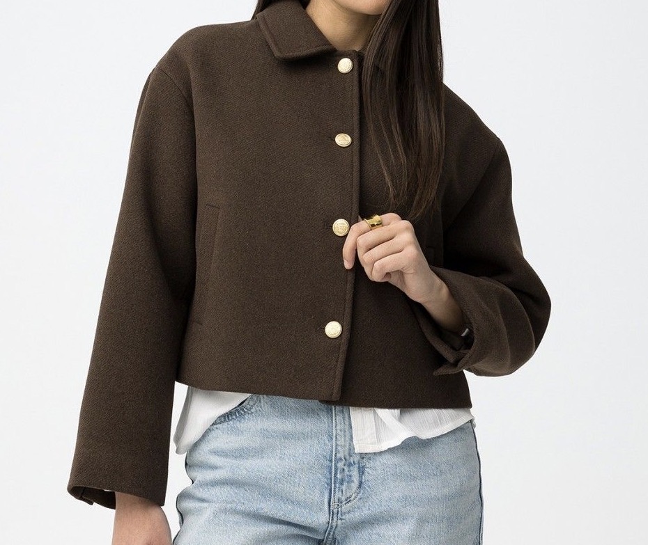 Casaco corto en marrón chocolate con botones dorados y corte relajado, ideal para un look casual.