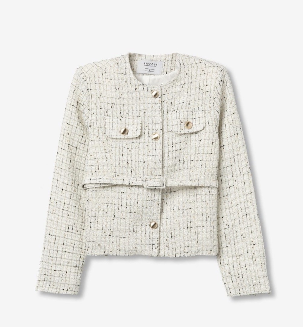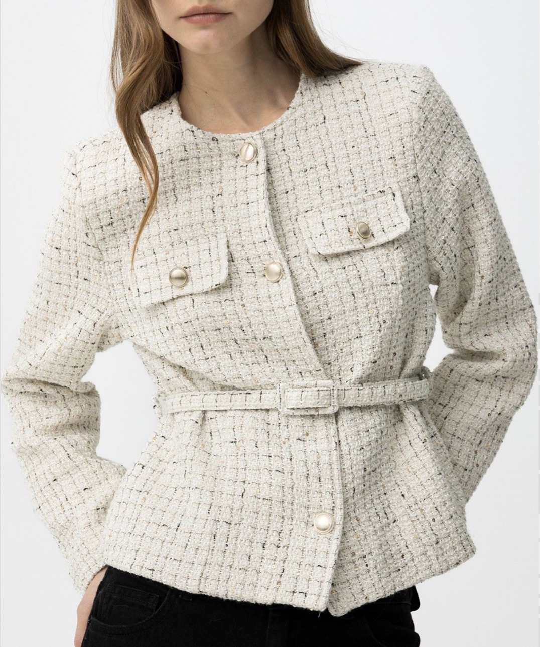 Chaqueta de corte regular en color crudo, textura tweed, bolsillos delanteros, botones forrados y cinturón ajustable.