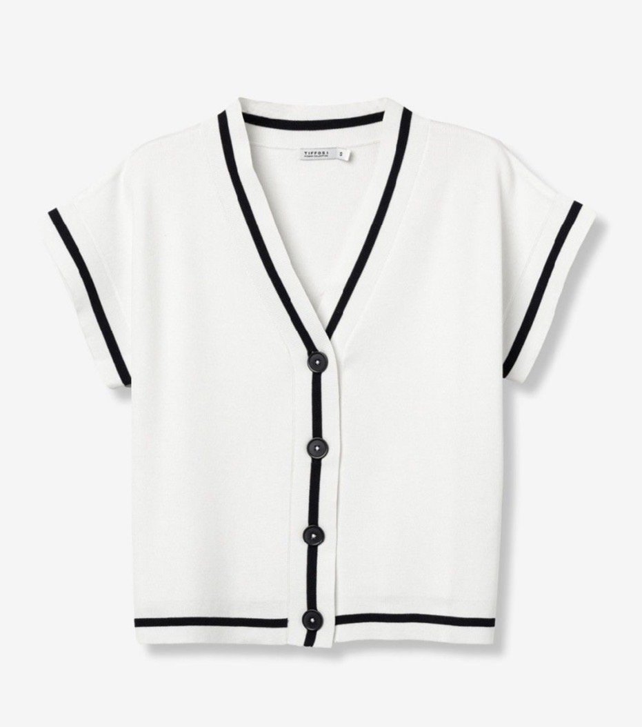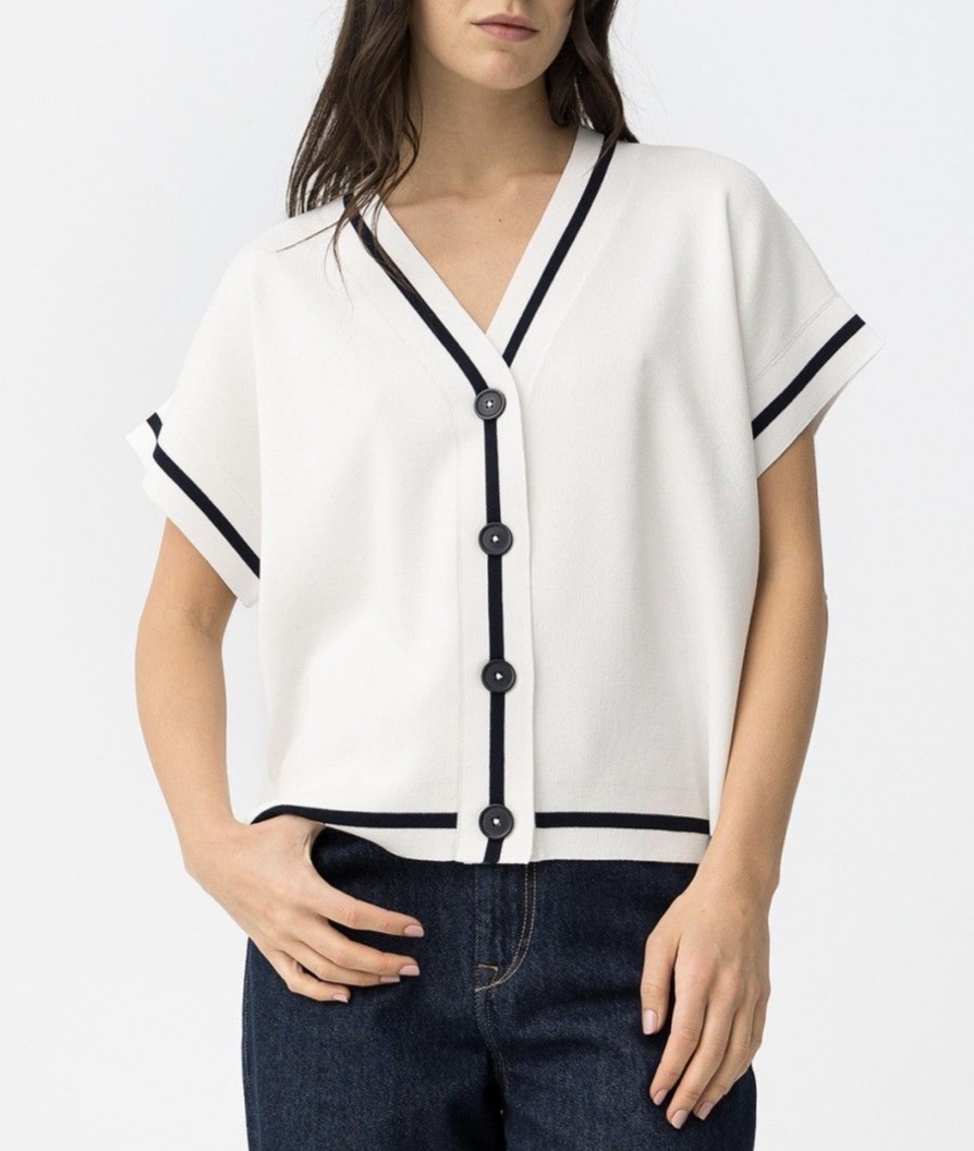 Camiseta de color crudo, corte relaxed, manga corta, botones frontales y detalles en azul marino.
