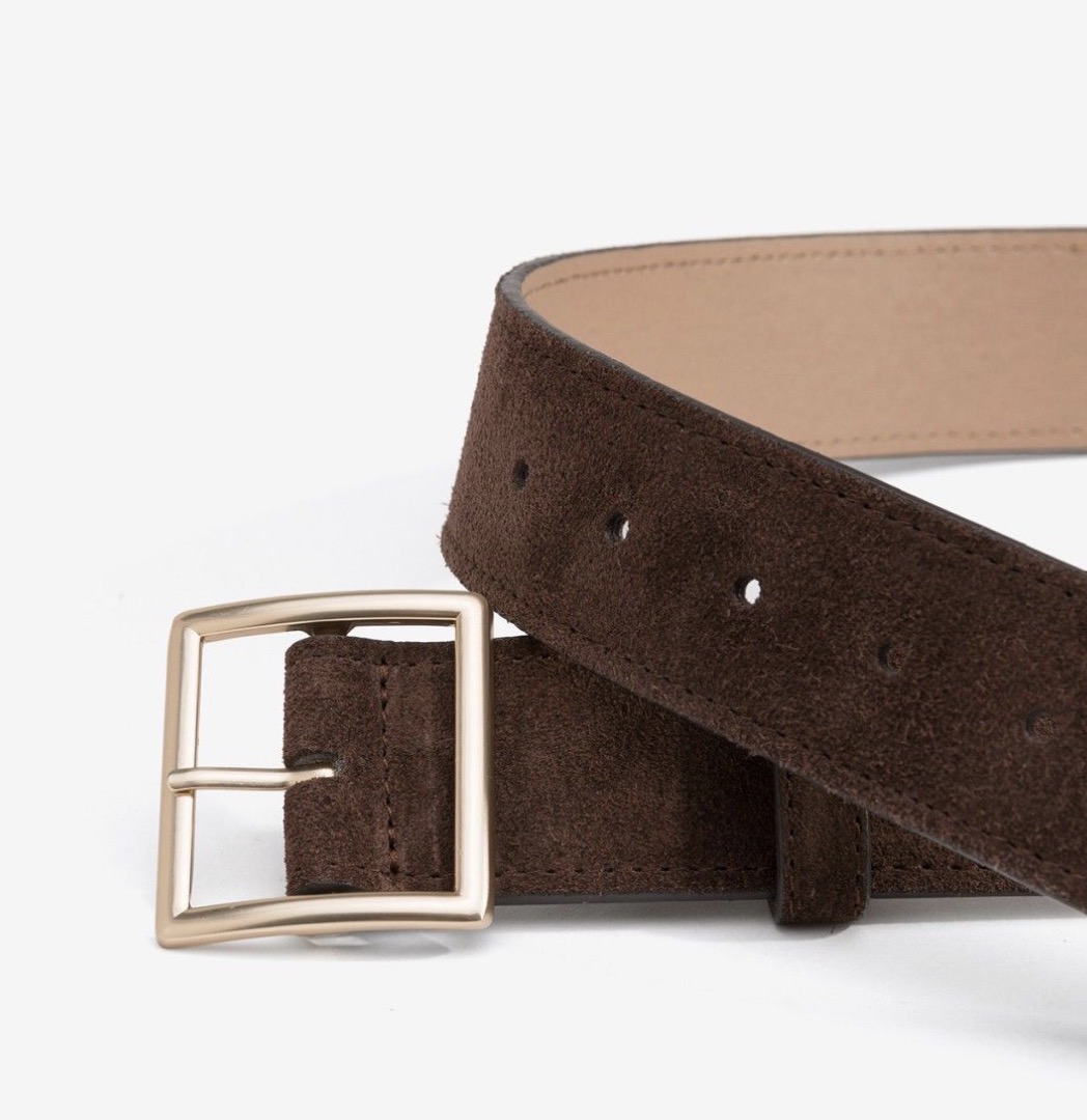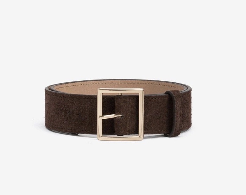 Cinturón marrón oscuro con hebilla cuadrada dorada, estilo sofisticado y atemporal.