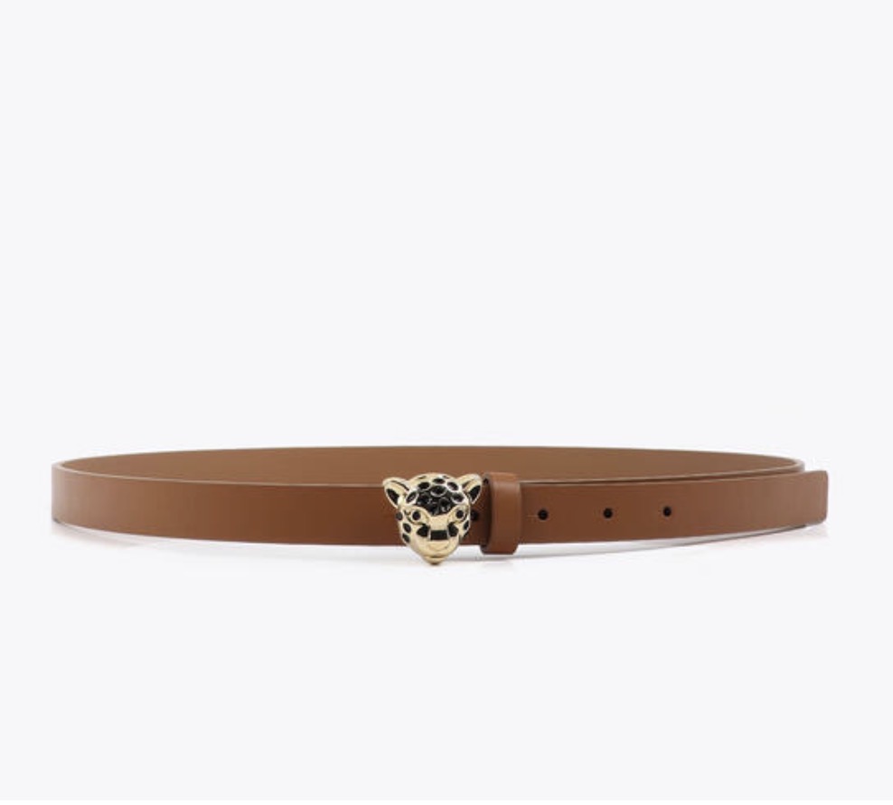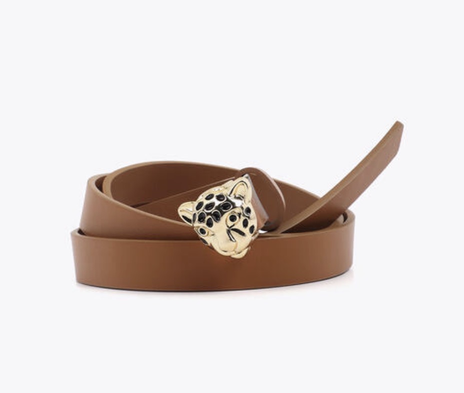 Cinturón de cuero con hebilla dorada en forma de leopardo. Diseñado para resaltar cualquier conjunto con un toque de sofisticación audaz. Ajustable para un ajuste perfecto y cómodo.