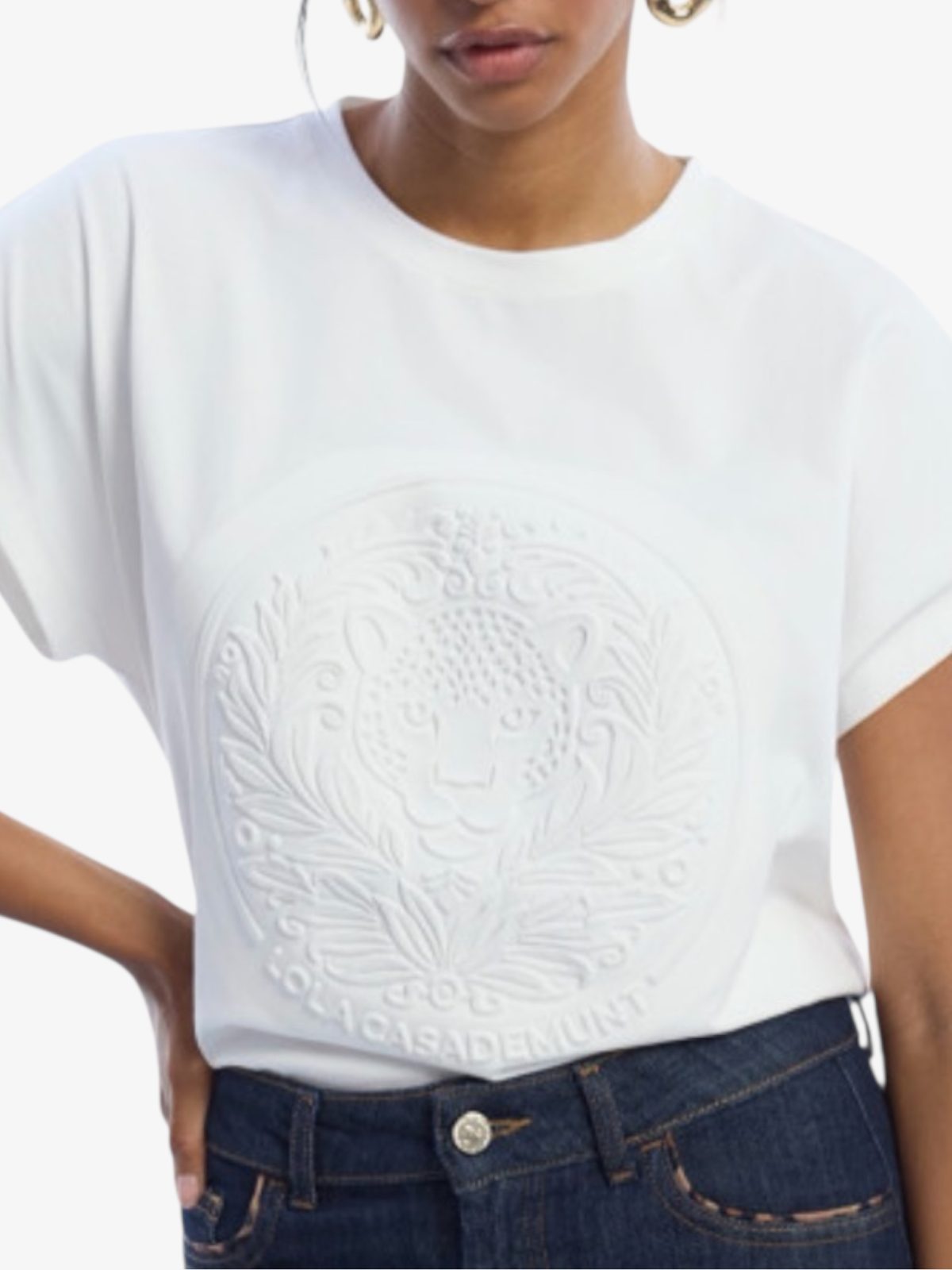 Camiseta blanca de manga corta con logo en relieve, confeccionada en algodón suave. Corte relajado para un ajuste cómodo y moderno. Ideal para dar un toque exclusivo a tus conjuntos diarios. El diseño en relieve aporta textura y dinamismo a esta pieza.