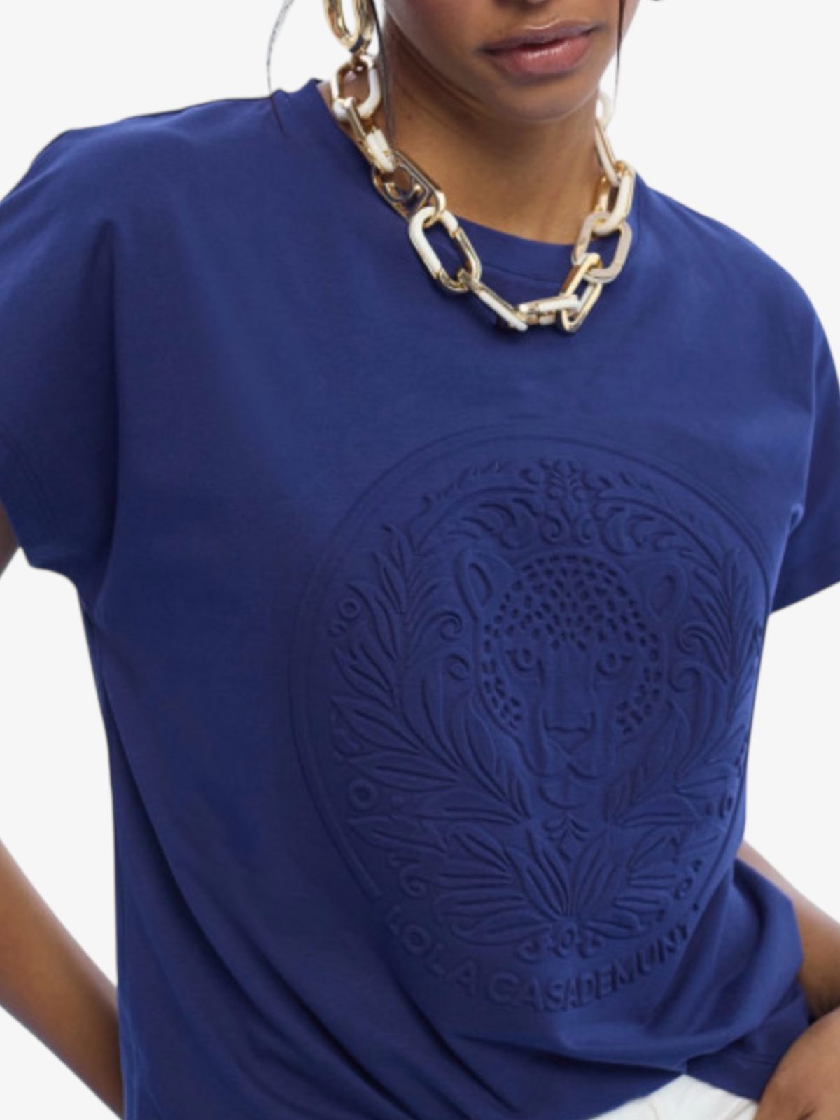 Camiseta de manga corta en tono azul intenso con logo en relieve en la parte delantera. Confeccionada en algodón de alta calidad para mayor confort. Perfecta para un look casual chic.