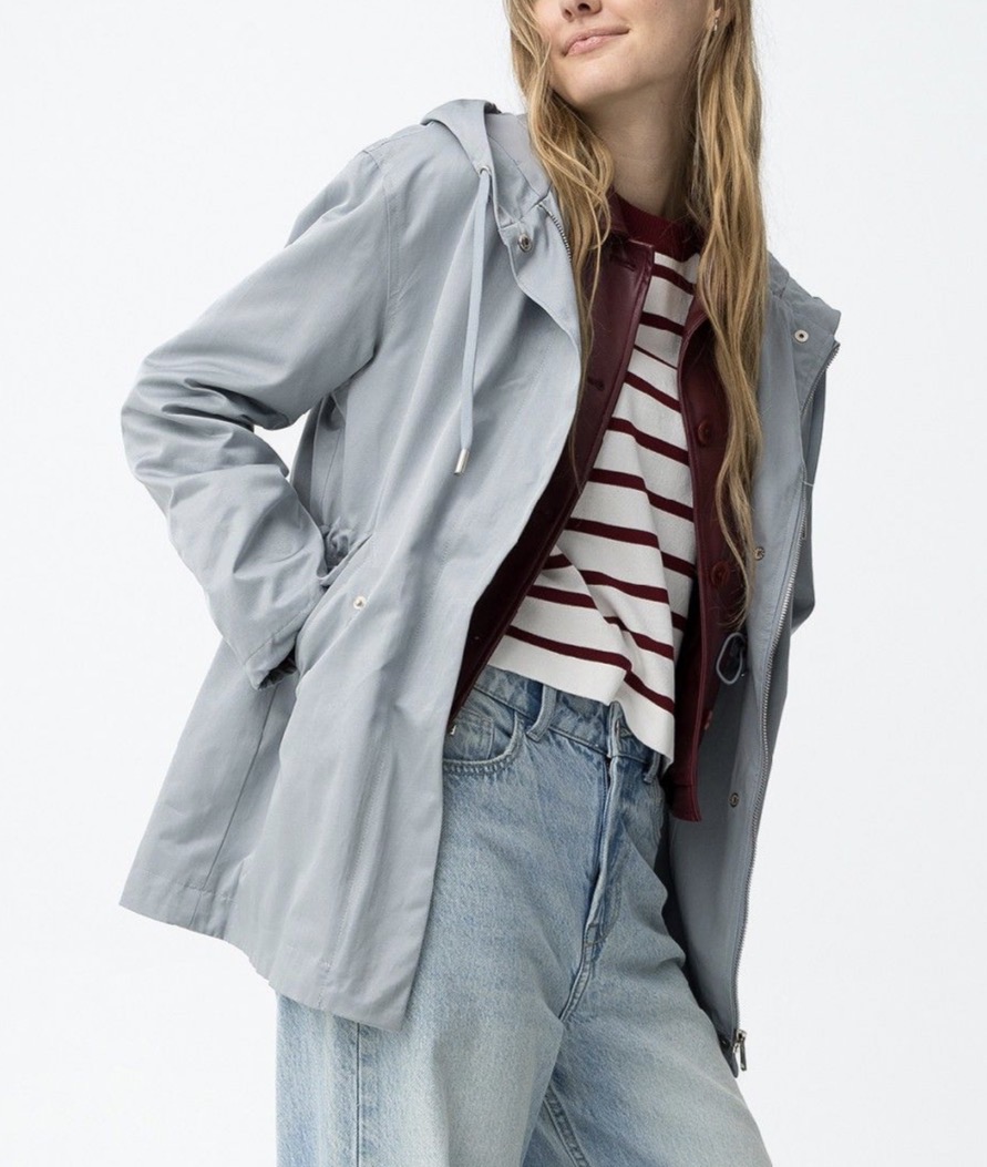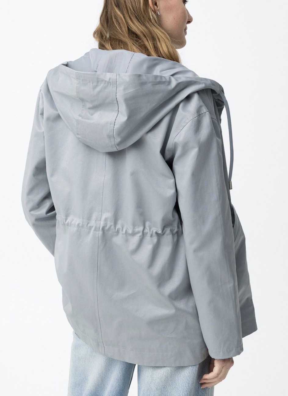 Chaqueta azul claro de corte relajado, con capucha, bolsillos delanteros y cierre de cremallera visible.